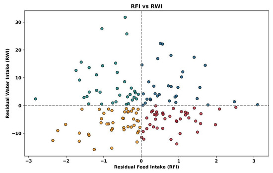 Plot of all individual animals’ residual feed intake (kg) vs. residual water intake (L). Gold dots represent animals efficient in water and feed use, blue dots represent animals inefficient in water and feed use, green dots represent animals inefficient in water use and efficient in feed use and red dots represent animals efficient in water use and inefficient in feed use.