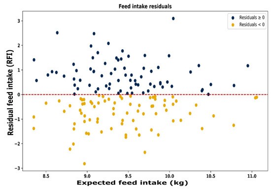 Residual vs. expected feed intake (kg), demonstrating that animals are efficient (positive RFI) or inefficient (negative RFI) throughout the range of expected feed intakes. Red line represents the average efficiency for the group.