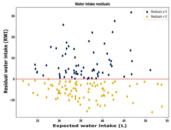 Residual vs. expected water intake (L), demonstrating that animals are efficient (positive RWI) or inefficient (negative RWI) throughout the range of expected water intakes. Red line represents the average efficiency for the group.