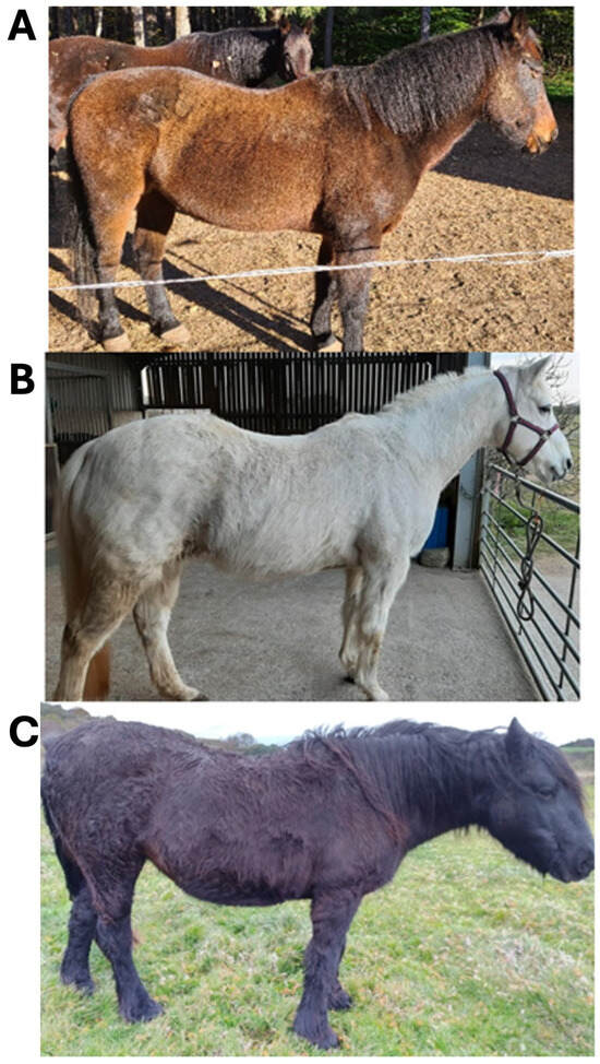 Photographic examples and description of each hypertrichosis score (1–3) assigned to study horses. (A) 1: Regional hair coat abnormalities/long hair growth restricted to discrete areas; (B) 2: Generalised hair coat abnormalities, slightly to moderately long hair coat; and (C) 3: Severely long and/or curly hair coat over the entire body.