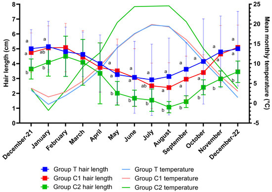Hair lengths (mean± SD) and corresponding mean monthly temperatures throughout the study for groups T (blue light treatment), C1 (medicated control) and C2 (unmedicated control). There was an effect of time (p < 0.001), group (p = 0.02) and group by time interaction (p = 0.005) for hair length. Differences in hair length between groups for each month are indicated by different letters (a,b represents significance at p < 0.05). A significant effect of time was observed for temperature (p < 0.0001), but no group (p = 0.59) or group by time interaction effect (p = 0.53) was observed. There were no significant temperature differences between group means for any month (p > 0.05 for all).