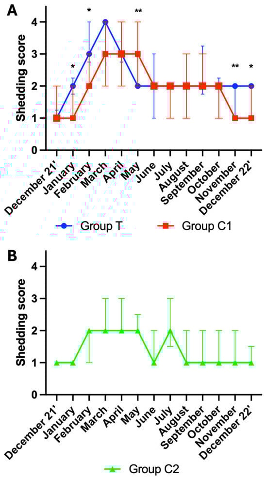 Mann–Whitney tests revealed group differences between group T and C1 for the following months: January (p = 0.013), February (p = 0.016), May (p = 0.005), November (p = 0.002) and December 22’ (p = 0.046). Shedding scores were higher in group T for all but May, where they were lower. As group C2 was distinctly different to group T and group C1, no further multiple comparison analysis was performed on the data from this group. For visualisation purposes, the shedding scores are graphically presented as the median ± interquartile range (IQR) for groups T and C1 (Figure 3A) and for group C2 (Figure 3B).