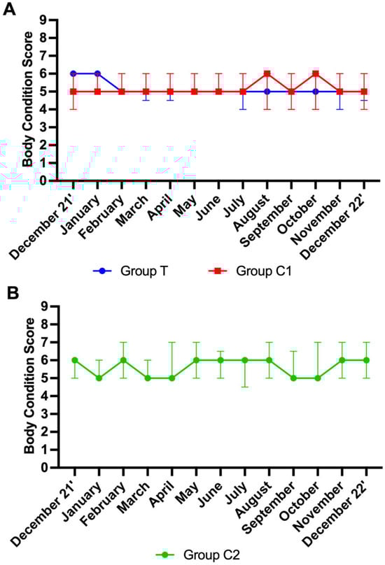 A total of 681 scores were analysed. Data from participants for which more than three scores were missing were not included in the analysis. Final group numbers were as follows: group T (n = 21), group C1 (n = 19), group C2 (n = 13). Missing scores were due to participant non-compliance, shipping issues, and euthanasia of horses due to age-related ill-health. No effect of time was observed for BCS in groups T and C1 (p > 0.05 for both). An effect of time on BCS for C2 was observed (p < 0.01). Mann–Whitney tests showed no significant differences between groups T and C1 at any time point (p > 0.05). As group C2 was distinctly different to group T and group C1, no further multiple comparisons analysis was performed on the data from this group. For visualisation purposes, BCS are graphically presented as the median ± IQR per month for groups T and C1 (Figure 4A) and group C2 (Figure 4B).