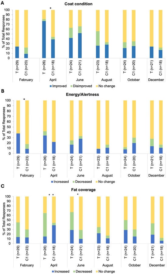 There was a significant association between group and response frequency in relation to coat condition changes in the April BMQ (p = 0.02; Figure 5A). The response ‘Increased/Improved’ was selected by 77% of respondents in group T and 39% in group C1. There was an association between group and response frequency in relation to energy and alertness in the February BMQ (p = 0.02; Figure 5B). The response ‘Increased/Improved’ was selected by 38% of respondents in group T versus 9% in group C1. There was an association between group and response frequency in relation to fat coverage for both April and June BMQs (p = 0.005, p = 0.04 respectively; Figure 5C). The response ‘Decreased/Disimproved’ was reported by 50% of group T respondents versus 5% of C1 respondents in April. No significant differences in the frequency of specific responses between groups for any month (all p > 0.05) were observed for changes in medication dosage, other health indicators explored (muscle tone, appetite, sociability, sweating, drinking, urination, stereotypical behaviours) and blanketing. Response frequencies for other negative health incidents (sole abscesses, skin infections, respiratory infections and corneal ulceration, dry eye and stomach ulcers) were very low for the individual incidences reported. Cumulative response frequencies (presence/absence of negative health incidences) did not differ between groups (p > 0.05). Comorbidities reported in very low frequencies each month were as follows: insulin dysregulation, laminitis, tendonitis, and desmitis. Cumulative response frequencies (presence/absence of comorbidities) did not differ between groups (p > 0.05).