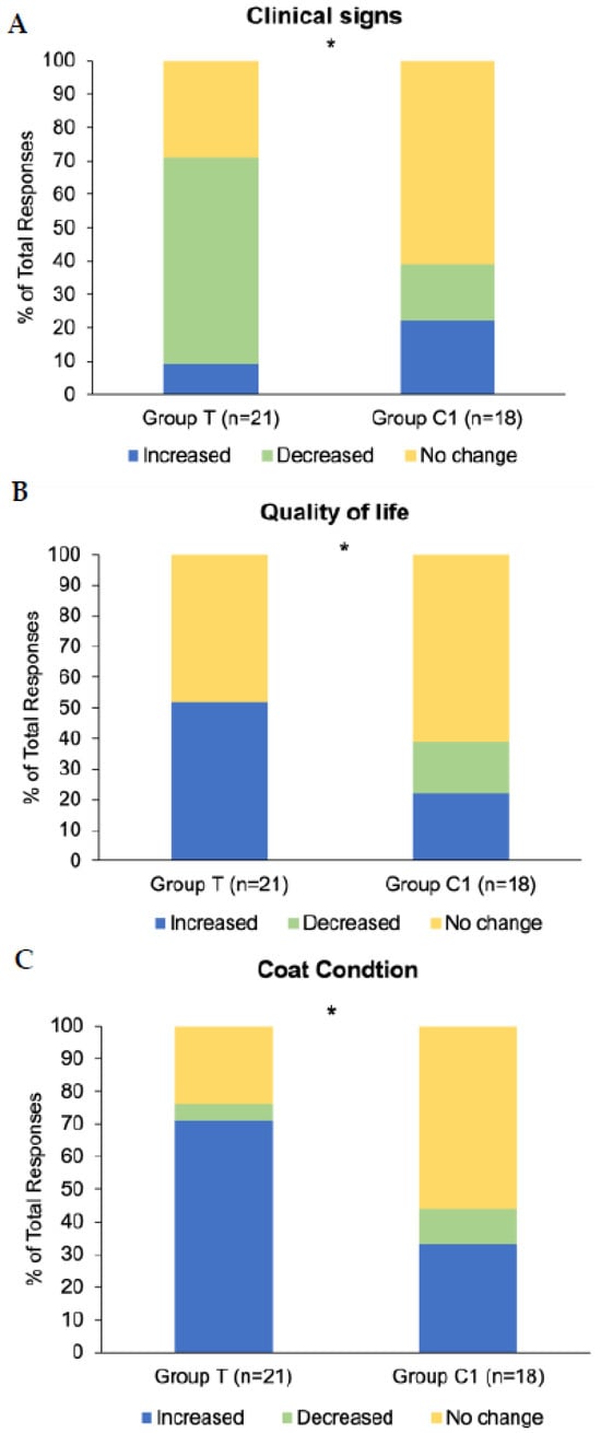 Twenty-one participants in group T (n = 21) and 18 participants in group C1 (n = 18) responded to the final questionnaire. Exploration of associations between group (T and C1) and response (increased/improved, decreased/disimproved, and no change) frequency revealed significant associations for changes in clinical signs (p = 0.02; Figure 6A), quality of life (p = 0.03; Figure 6B), and coat condition (p = 0.04; Figure 6C), whereby the response ‘Increased/Improved’ was higher in group T for all three. There were no significant associations between group and response type for questions regarding muscle tone (p = 0.31), energy (p = 0.15) and sociability (p = 0.57). Results for the parameters with significant associations are graphically presented as the percentage of each response as a proportion of the total number of responses to the questionnaire (Figure 6).
