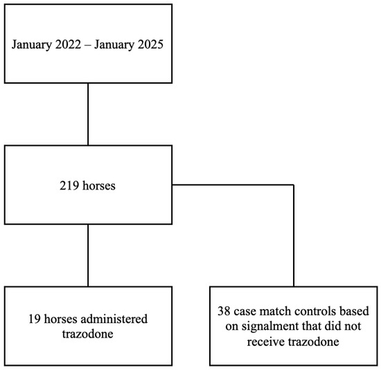 Flow diagram for identification of horses that underwent anesthesia for an orthopedic MRI from January 2022 to January 2025. In total, 19 horses were identified to have received trazodone prior to anesthesia and 38 case-matched control horses were selected.