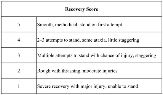 Medical records were reviewed by two authors (EJ, MM), and data collected included patient demographics (age, breed, weight, sex), procedural information, anesthetic drug protocols, and anesthesia time. For cases that received trazodone, the dose, frequency, and timing of the last dose prior to anesthesia were recorded. Recovery time, recovery scores, and complications during recovery were recorded. Recovery scores utilized were standard for the facility (Figure 2). Sedative and reversal agent administration during the recovery period was also recorded. Recovery complications were defined as the occurrence of fractures, myopathy, neuropathy, airway obstruction, pulmonary edema, or failure to stand.