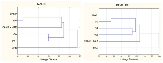 Mahalanobis distances for 399 males and 251 females of five Spanish dog breeds1 and one crossbreed population using fifteen morphometric variables. CAMP = Podenco Campanero; CAMP × MAE = Podenco Campanero × Spanish Mastiff; MV = Valdueza; GA = Spanish Greyhound; MAE = Spanish Mastiff; PAT = Podenco Paternino.
