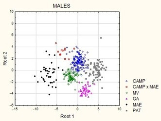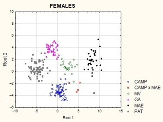 Canonical representation of 399 males and 251 females of five Spanish dog breeds1 and one crossbreed population using fifteen morphometric variables. CAMP = Podenco Campanero; CAMP × MAE = Podenco Campanero × Spanish Mastiff; MV = Valdueza; GA = Spanish Greyhound; MAE = Spanish Mastiff; PAT = Podenco Paternino.