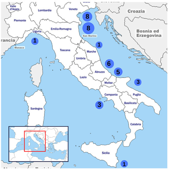 - Prioli, G. La Molluschicoltura in Italia. In Estado Actual Del Cultivo y Manejo de Moluscos Bivalvos y su Proyección Futura: Factores Que Afectan su Sustentabilidad en América Latina; Lovatelli, A., Farías, A., Eds.; FAO Actas de Pesca y Acuicultura; FAO: Roma, Italy, 2008; pp. 159–176. [Google Scholar]