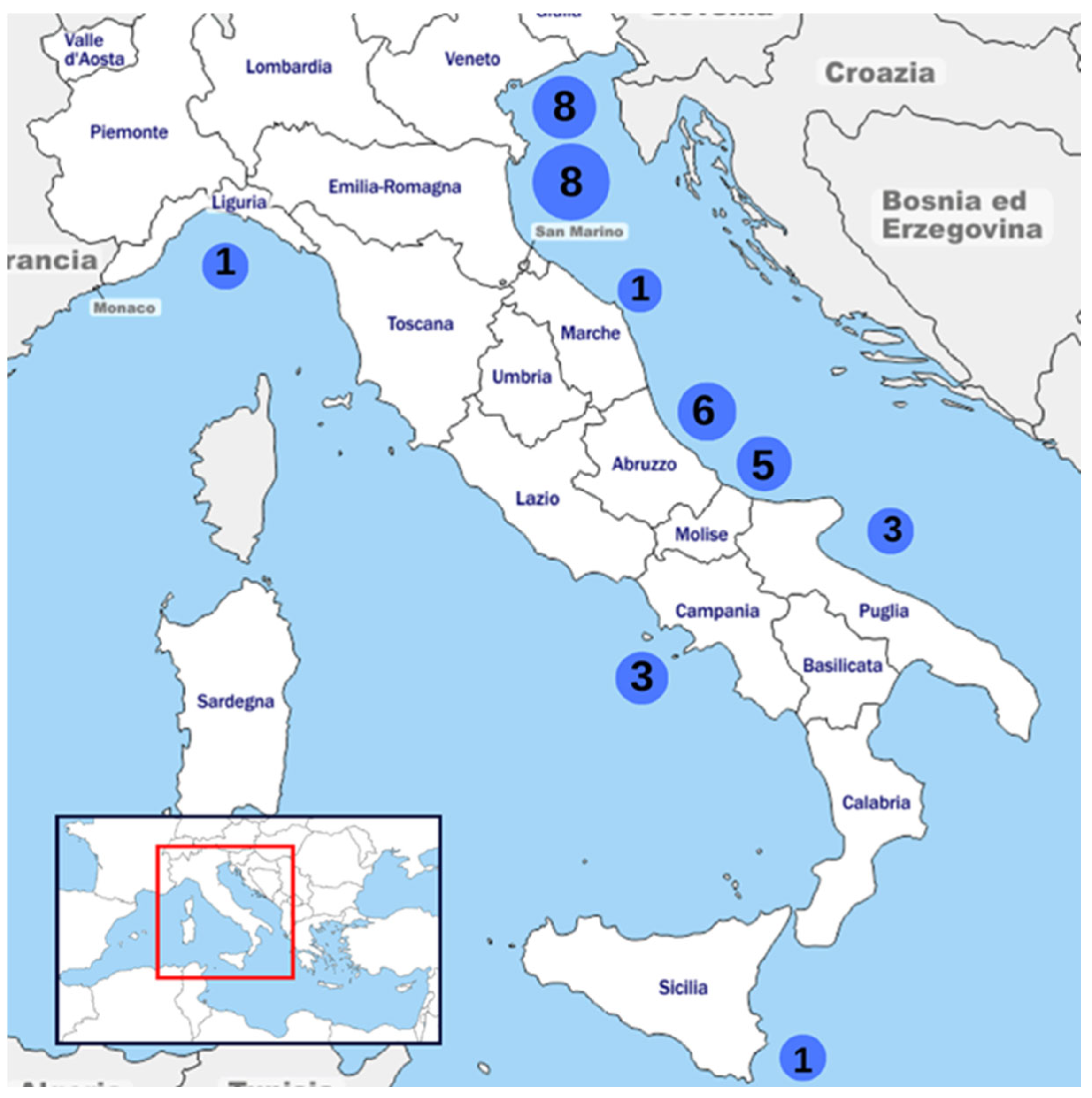 Figure 1. Geographical distribution of mussel farms that responded to the survey along the Italian coast. Each blue circle represents a region, and the number inside indicates how many farms per region responded, for a total of 36.