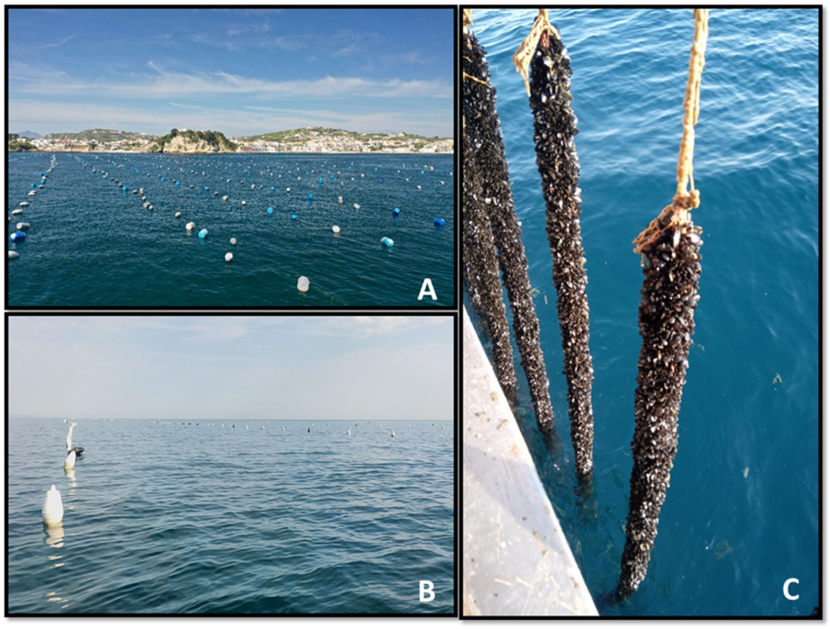 Italy is the fourth largest aquaculture producer among European countries, with a national output of 129.746 tons in 2023 [6]. Bivalve shellfish represent a significant portion of the production, led by Mediterranean mussels (Mytilus galloprovincialis; Lamarck, 1819) (57.279 t) and Manila clams (Ruditapes philippinarum; Adams & Reeve, 1850) (21.547 t), as well as the still-limited production of Pacific oyster (Magallana gigas; Thunberg, 1793) (302 t), generating an estimated value of over EUR 285 million [7]. Concerning mussels, they are produced in most Italian coastal regions, mainly Friuli-Venezia Giulia, Veneto, Emilia-Romagna, and Marche regions on the Adriatic Sea. Other significant production sites are located in Puglia, on the Ionian Sea, and in the Liguria, Sardinia and Campania regions on the Tyrrhenian Sea [8].