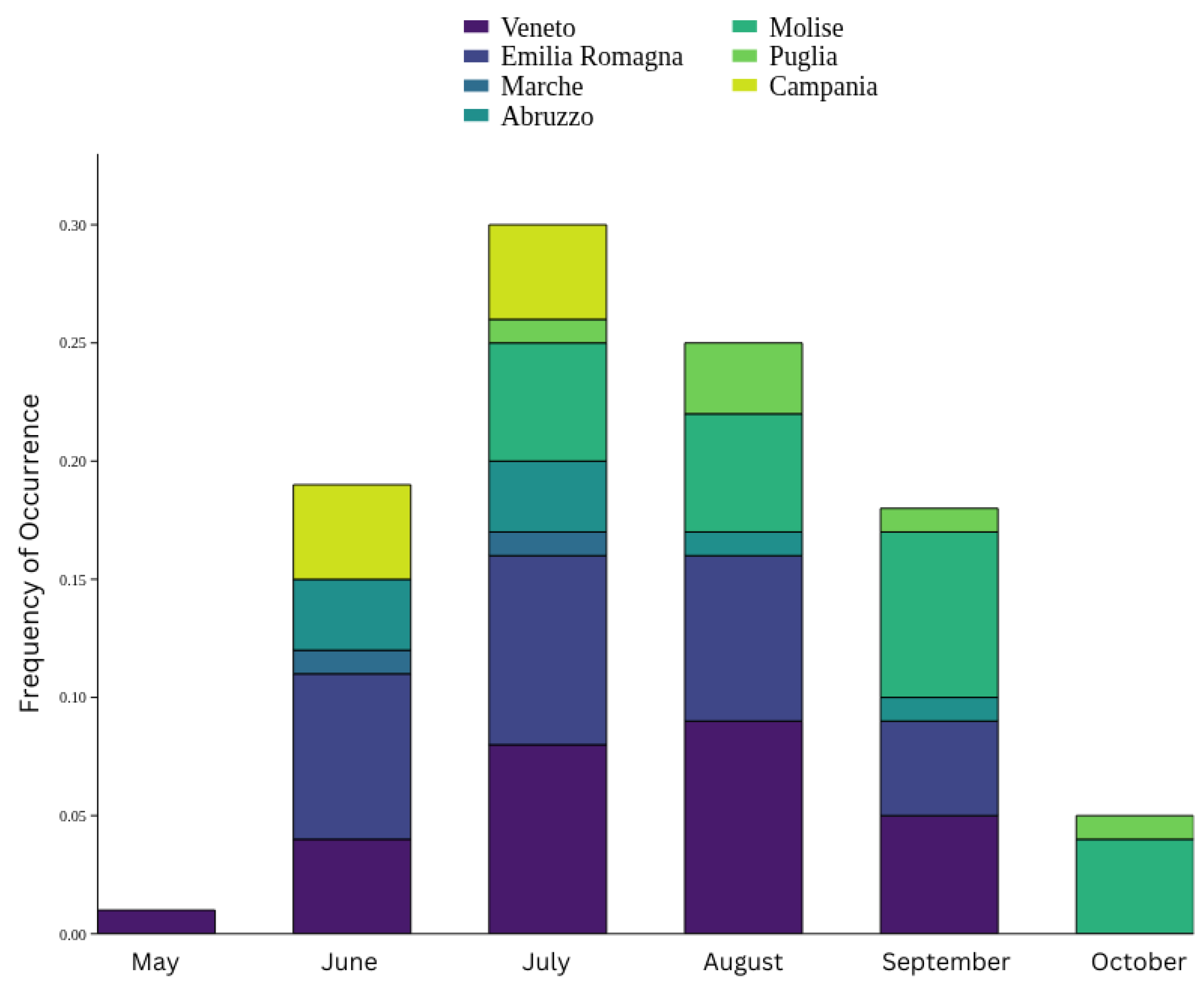 Sea turtles are mostly observed during summer, with the highest frequency in June, July, and August. Specifically, in the northern Adriatic Sea (Veneto and Emilia Romagna regions), farmers usually spot sea turtles more often in July, August and September. In October, sea turtles are reported more southernly (Molise and Puglia) (Figure 4). In general, according to the survey, sea turtles are mostly observed in the morning (51.5% early morning, 45.5% late morning) and very rarely in the afternoon (3%).