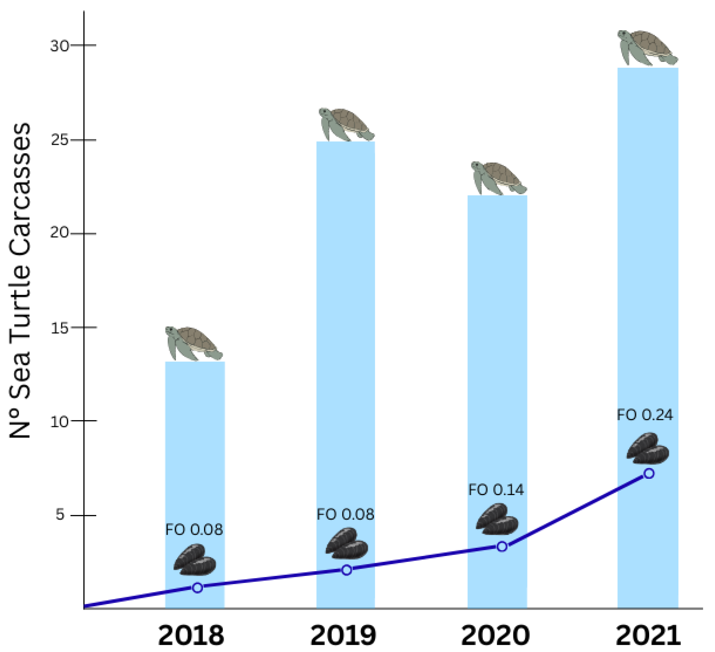 Figure 6. Ingestion of Mytilus galloprovincialis compared to the carcasses analyzed over the years (2018–2021). A frequency of occurrence (FO) refers to the M. galloprovincialis ingestion per year.