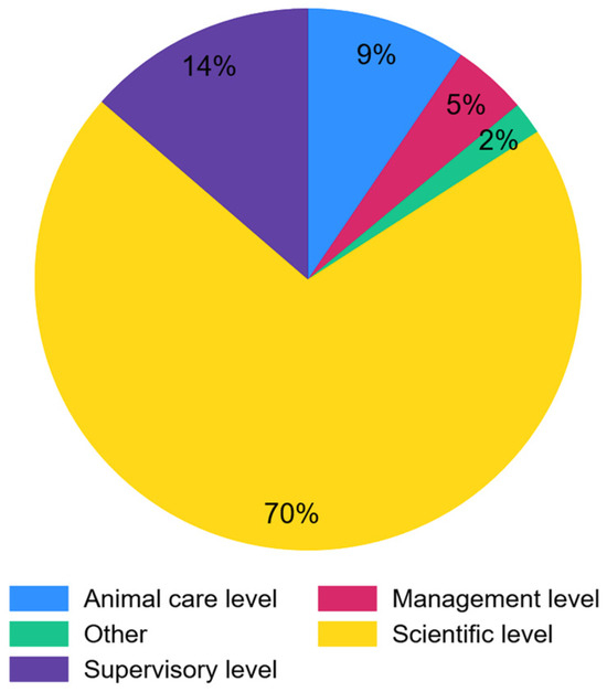The demographic data of the research are based on Figure 1. The science group accounts for the largest proportion of respondents at 70%. This is followed by the regulatory level with 14%, the care level with 9%, the management level with 5%, and others with 2%. Others were not integrated into the analysis due to working outside lab animal institutions. The mean age of all respondents was 39.99 years. A question regarding gender classification was not given. Of all the animal facilities in which the respondents work, 50.5% are externally accredited.