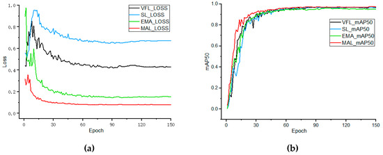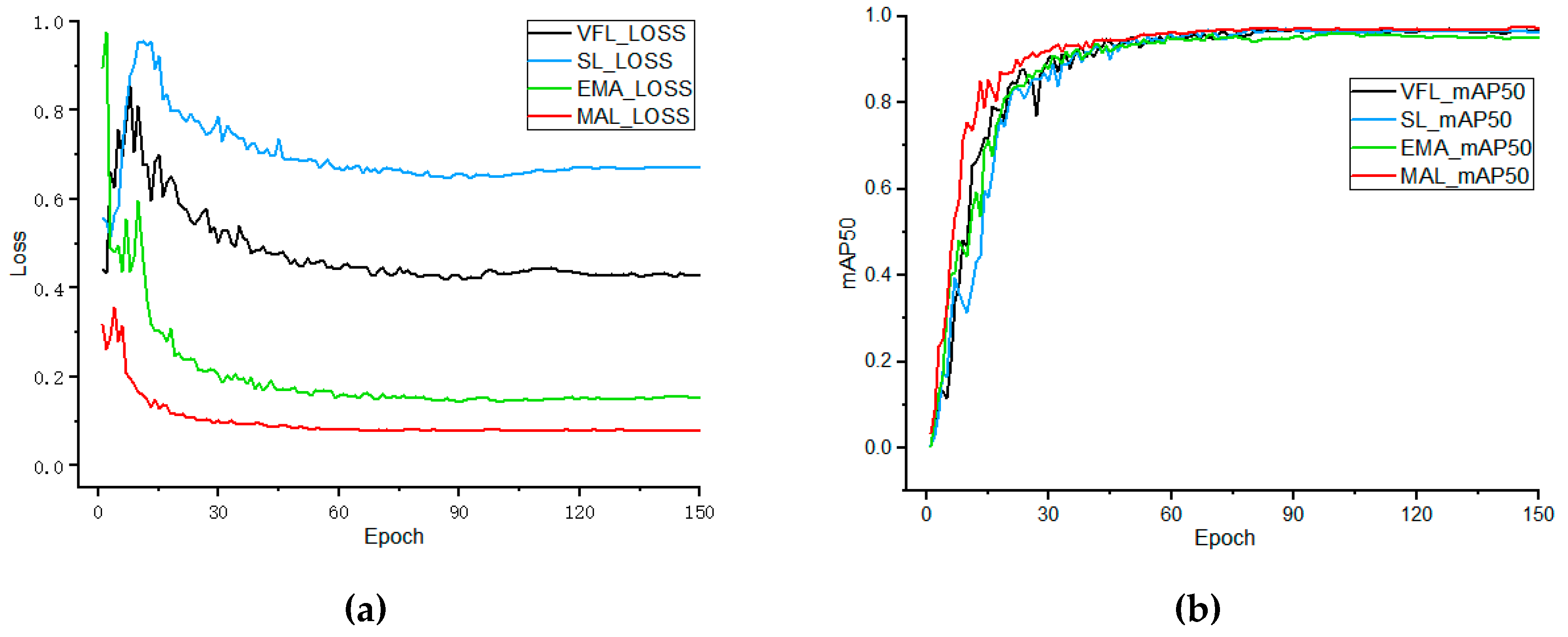 Figure 7a indicate that MAL reaches a convergence plateau at around 31 epochs, whereas VFL and Slide Loss require 37 and 39 epochs, respectively. Although EMASlide Loss also converges at approximately 31 epochs, its final mAP50 and mAP50:95 still lag behind MAL. Considering MAL’s leading performance in Precision, Recall, F