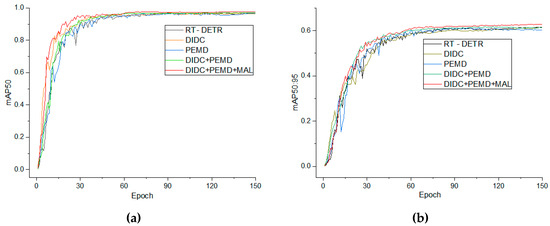 Figure 8 clearly demonstrate the combined advantages of the DIDC–PEMD–MAL configuration in convergence speed, training stability, and final plateau height. First, the DIDC module enhances the representation of fine-grained and direction-sensitive features, promoting the quality of candidate boxes in the early training stages and accelerating the rise of mAP. Second, PEMD, through polar-coordinate attention, distribution stabilization, and high-frequency detail compensation, effectively mitigates performance decline in the middle and later stages, resulting in a smoother convergence curve and a higher plateau. Finally, MAL strengthens the gradient response to low-quality matched samples through its match-driven loss design, significantly suppressing training oscillations and improving consistency in localization and confidence. Therefore, the steeper rise, earlier stabilization, and higher plateau shown in the figure are not isolated phenomena but a direct reflection of the three modules complementing each other during training, indicating that DIDC–PEMD–MAL indeed outperforms other comparison configurations in terms of convergence and generalization capability.