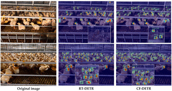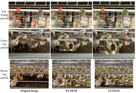 To intuitively evaluate the detection robustness and interpretability of the baseline RT-DETR and the proposed CF-DETR in complex farming environments across different growth stages, we selected representative samples from the fattening, growing, and brooding periods for visual comparison. As shown in