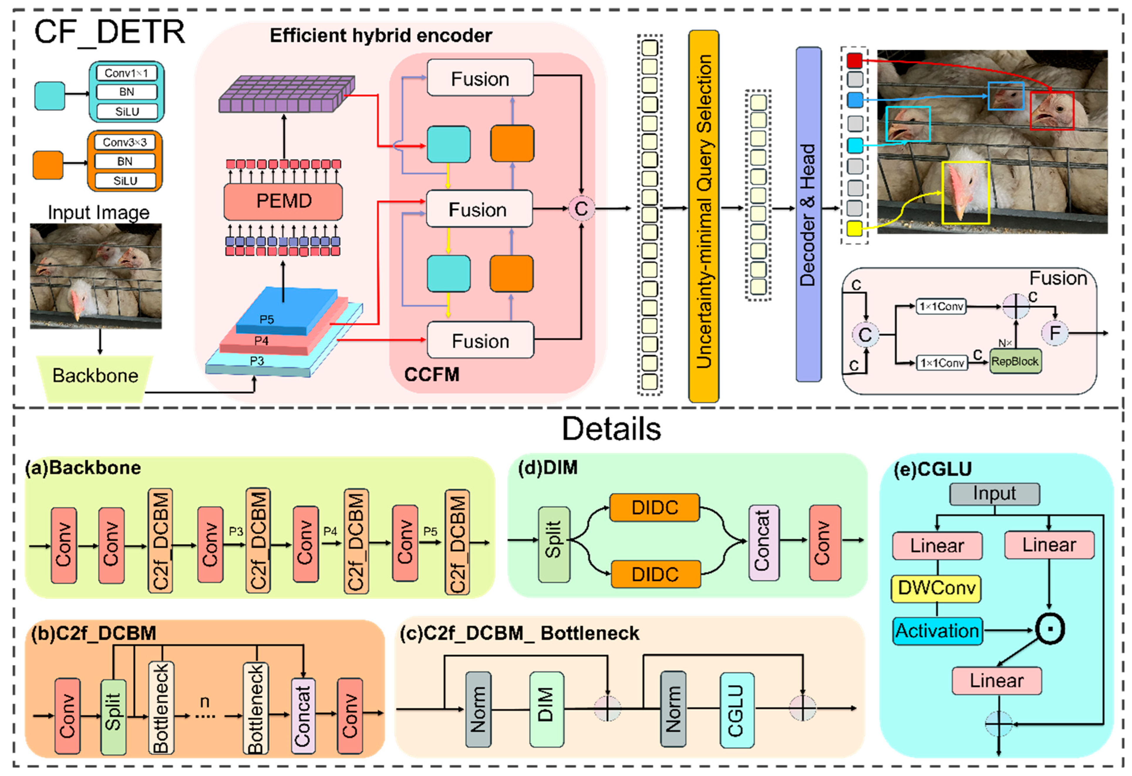 11]. To address this, we selected RT-DETR as the starting point. RT-DETR offers advantages in end-to-end detection and the removal of NMS, while achieving a balance between accuracy and speed through a hybrid convolutional backbone and an efficient encoder. However, the native RT-DETR structure exhibits shortcomings in chicken face scenarios. The ResNet backbone has limited capability to express subtle texture differences [