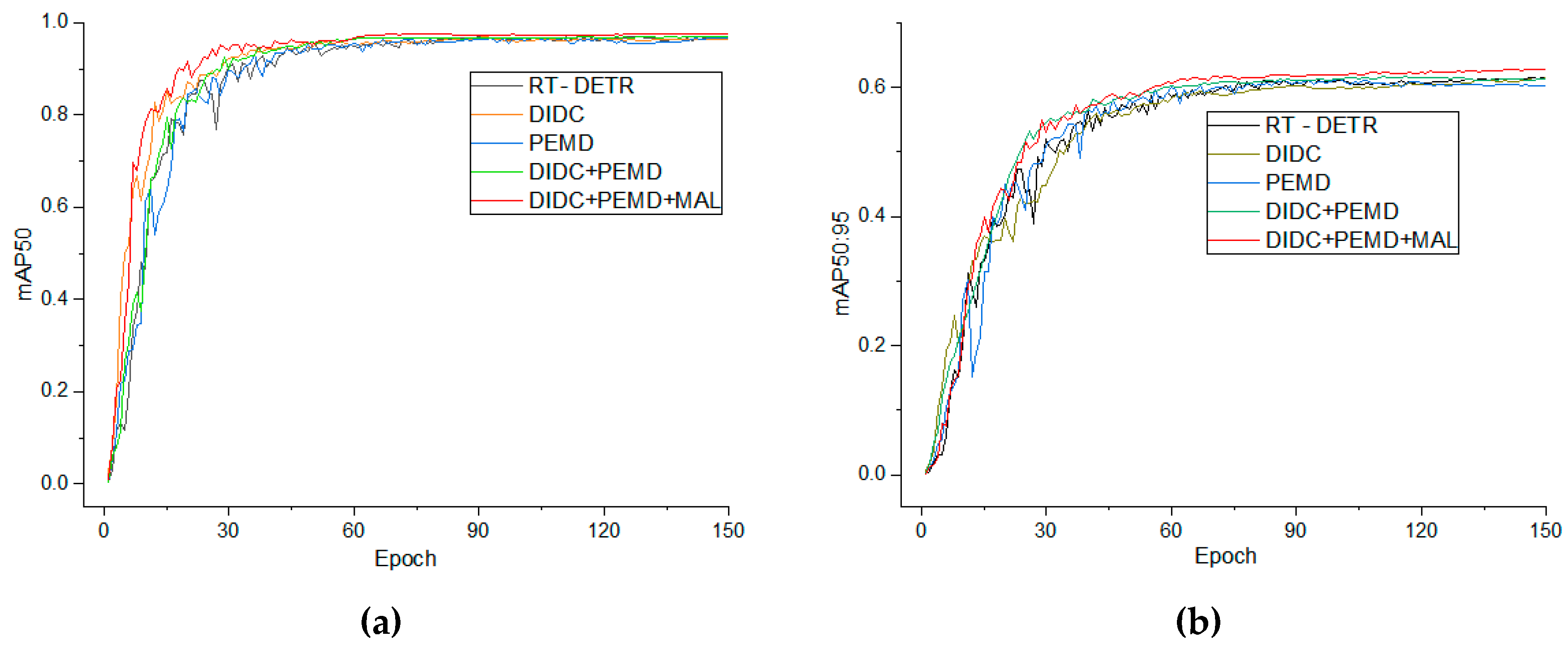 To verify the effectiveness of the systematic structural optimization proposed in this study within the RT-DETR framework—focusing on three key aspects: feature extraction (DIDC), information encoding (PEMD), and loss design (MAL)—we conducted ablation experiments based on RT-DETR under the same experimental settings. The experiments considered not only commonly used detection accuracy metrics (mAP50, mAP50:95, Precision, Recall, F1) but also included model parameters, FLOPs, and inference speed, enabling a comprehensive evaluation from both detection performance and embedded deployment feasibility perspectives.