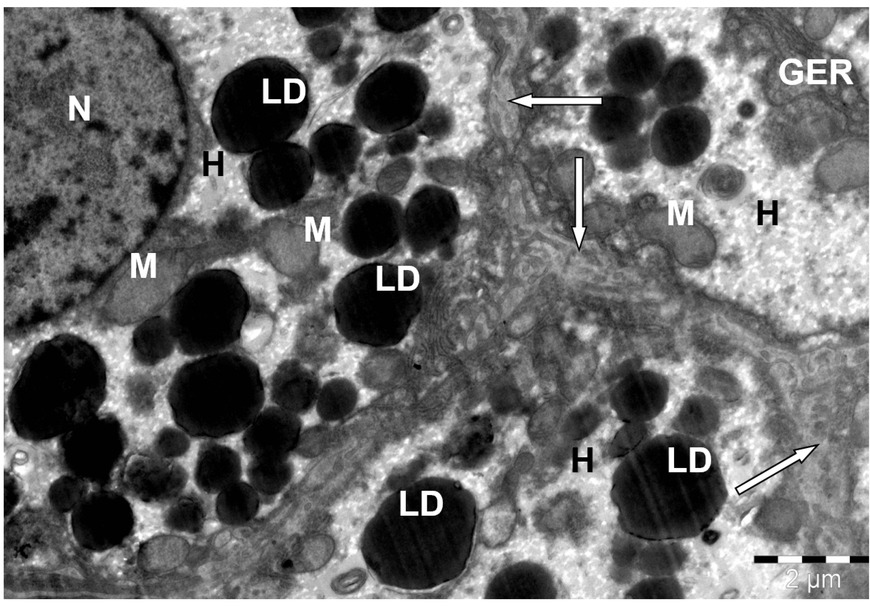 - Prusakova, A.V.; Zelenevskiy, N.V.; Prusakov, A.V.; Yashin, A.V.; Ponamarev, V.S. Ultrastructural organization of liver hepatocytes of the Anglo-Nubian goat. Vet. Glas. 2023, 77, 176–187. [Google Scholar] [CrossRef]
