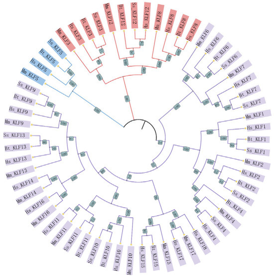 A total of 62 KLF genes were identified across four species based on the presence of the conserved zf-H2C2 domain: 18 in Homo sapiens (Hs), 17 in Mus musculus (Mm), 13 in Sus scrofa (Ss), and 14 in Bos taurus (Bt); the protein sequence is shown in Table S3. To investigate the evolutionary relationships among KLF family members, an NJ phylogenetic tree was constructed using protein sequences of these 62 genes (Figure 1). Phylogenetic analysis classified the genes into three distinct groups (I–III) based on sequence homology and branching patterns. Group I (red, 12 genes) contained orthologs such as Mm-KLF3/12/8, Hs-KLF3/12/8, Ss-KLF3/12/8, and Bt-KLF3/12/8. Group II (blue, 4 genes) included Mm-KLF5, Hs-KLF5, Ss-KLF5, and Bt-KLF5. The remaining 46 genes formed Group III (purple), representing a larger divergent cluster.