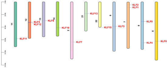 The 14 identified bovine KLF genes were unevenly distributed on 11 chromosomes (Figure 2). Chromosomes 7, 8, and 12 contain two KLF genes each, while the remaining 8 chromosomes contain one gene each. KLF1 and KLF2 are located on chromosome 7, KLF4 and KLF9 are located on chromosome 8, and KLF5 and KLF12 are located on chromosome 12. A single gene is located on chromosome 2 (KLF7), chromosome 6 (KLF3), chromosome 11 (KLF11), chromosome 13 (KLF6), chromosome 14 (KLF10), chromosome 21 (KLF13), chromosome 22 (KLF15), and chromosome X (KLF8). Table 1 provides detailed information on the genome coordinates, protein germplasm (UniProt), and coding sequences (CDS) of all 14 genes.
