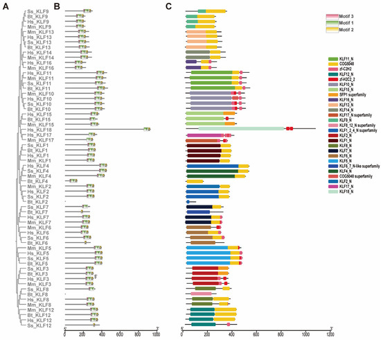 Phylogenetic relationships, Motif identification, and gene structure analysis. (A) Phylogenetic tree constructed by the neighbor-joining method, representing evolutionary relationships among 62 KLF genes across four species: B. taurus, H. sapiens, M. musculus, and S. scrofa. (B) Distribution of conserved protein motifs across the KLF gene family. Colored boxes represent distinct conserved motifs; gray lines correspond to non-conserved linker regions. (C) Conserved domain architecture of the KLF genes, illustrating functional protein domains shared across species.