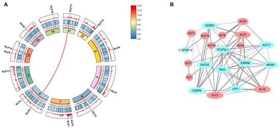Synteny analysis and interaction network analysis. (A) Circos plot depicting genomic synteny of the KLF gene family across the bovine genome. The innermost ring represents the 11 chromosomes, while the middle and outer rings display gene density gradients via heatmap and linear plots (red: high density; white: medium; blue: low). KLF gene loci are annotated along the chromosomes. Colored arcs indicate collinear relationships between chromosomes, revealing conserved syntenic blocks involving KLF genes. (B) Protein–protein interaction network of KLF transcription factors. Nodes represent KLF proteins and their functionally associated partners.