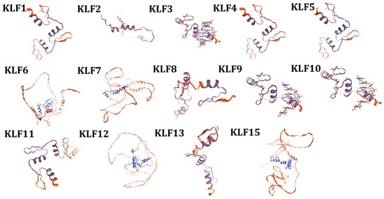 Homology modeling using the SWISS-MODEL server generated tertiary structure predictions for 14 bovine KLF proteins (Figure 5). The three-dimensional structure of proteins consists of motifs and domains. The activity and function of proteins are not only determined by the primary structure of protein molecules, but also closely related to their unique spatial structure. Incorrect spatial structure in proteins can lead to decreased protein function or even inactivation, which may also result in a series of mutations.