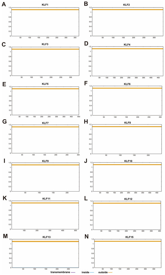 Transmembrane helix prediction was performed for all bovine KLF proteins using the TMHMM software (https://services.healthtech.dtu.dk/service.php? TMHMM2.0, accessed on 14 August 2025). Figure 6 shows the use of TMHMM to predict the transmembrane regions of 14 KLF protein sequences in bovine. The results show that none of the bovine KLF proteins contain transmembrane helical domains, as predicted by TMHMM. This finding is consistent with the well-established role of KLF transcription factors as intracellular proteins that function within the nucleus. The absence of transmembrane domains confirms that KLF proteins are not integral membrane proteins; however, subcellular localization (e.g., nuclear versus cytoplasmic) and potential secretion pathways would require further experimental validation using tools designed to predict signal peptides (e.g., SignalP) or nuclear localization signals (NLS).