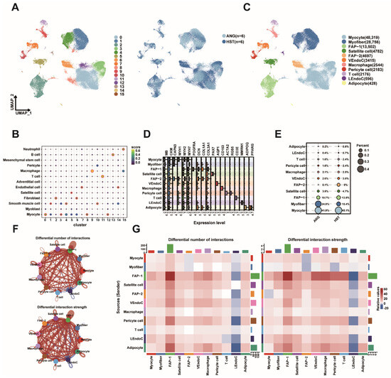 SnRNA-seq reveals multiple cell types in bovine LD. (A) UMAP graphs show unsupervised clustering of cells from all breeds identified by snRNA-seq. (B) The dot plot shows the automatic annotation of 16 cell clusters into 10 cell types using scMayoMap. (C) The UMAP graph shows the results annotated based on the Marker gene. (D) A box plot shows the expression of representative marker genes used in cell-type annotation. (E) The dot plot shows the proportion of each cell type in two breeds. (F) Comparison of the quantity and intensity of interaction between two types of LD cells. (G) Comparison diagram of the interaction between two breeds of LD cells. The left figure shows the number of interactions, and the right figure shows the strength of interactions between different cell types. The colored bar charts at the top and right represent the sum of values displayed in the heatmap. Red represents ANG stronger than HST, and blue represents HST stronger than ANG.