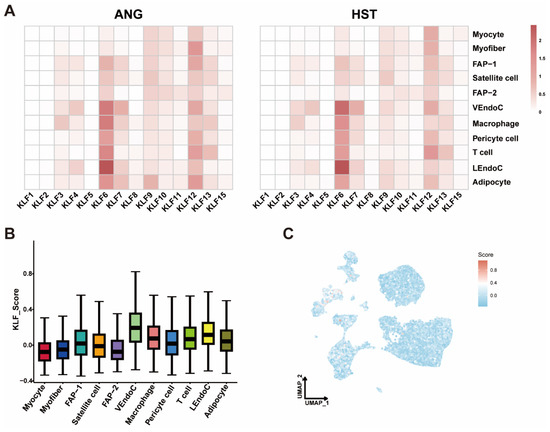 In order to analyze the cell-type-specific regulatory mechanism of the KLF transcription factor family in the bovine LD microenvironment and reveal the molecular regulatory differences between meat breed (ANG) and dairy breed (HST), we conducted an analysis of the expression of the KLF gene family in 11 cell types of ANG and HST cattle LD (Figure 8A). Overall, there was no heterogeneity in the expression of the KLF gene family in different cell types of breeds, but there were differences in expression patterns. We found that KLF6 had the highest expression level in LEndoC of two breeds, with higher expression in VEndoC of HST cattle than in ANG cattle. KLF6 was also expressed higher in FAP, Satellite cell, Macrophage, Pericyte cell, T cell, and Adipocyte of ANG cattle than in HST cattle. KLF1 and KLF2 are expressed at low levels in all cell types of both varieties. The KLF12 gene is also expressed in all cell types, and its expression is higher in Myofiber, FAP-1, VEndoC, Macrophage, Pericyte cell, LEndoC, and Adipocyte of ANG cattle than in HST cattle, while the opposite is true in other cell types. Please refer to Table S5 for detailed expression levels. Using the AddModule Score algorithm, we calculated the KLF scores for each cell type and merged 14 KLF genes into one gene set. Surprisingly, VEndoC had the highest KLF score, followed by macrophages and LEndoC, followed by T cells, while other cell types had lower scores (Figure 8B,C, Table S6).