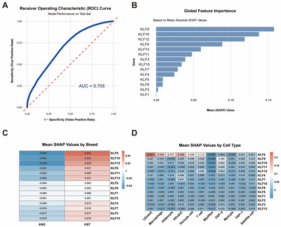 SHAP interpretation of the KLF gene. (A) The XGBoost classifier performance on test data is shown with a ROC curve (red line) and AUC value of 0.705. The dashed line represents the random guessing baseline (AUC = 0.5). (B) Bar plot showing mean absolute SHAP values for 14 KLF genes. (C) Heatmap comparing mean SHAP values between ANG and HST cattle. (D) Heatmap of mean SHAP values across 11 cell types.