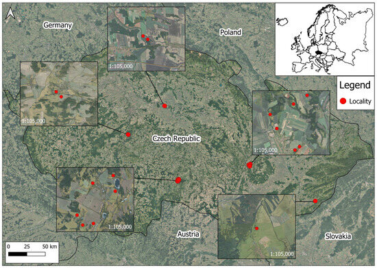 Within the Czech Republic, a total of 25 research areas were designated in 2023 and 2024 to test the validity of the odor repellent. The effectiveness was tested in permanent grasslands in the Central Bohemian Region, South Bohemian Region, and Vysočina Region. The typical localities of interest were hunting districts with mixed landscape cover. In general, the Czech Republic is covered by 33.4% forest, and this is also true for the selected locations (see Figure 1). Their altitudes ranged from 180 to 600 m a.s.l., and all study areas belong to Cfb—temperate oceanic climate according to Koppen’s climatic classification. From the perspective of roe deer management, the hunting bags from the last ten years ranged from 99,828 to 124,897 [28], which corresponds to an average annual hunting bag of 18 ind./1000 ha from the hunting ground area.