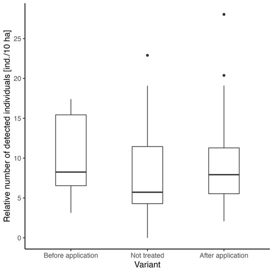 The assessment of the repellent effect on roe deer presence involved comparing the number of detected animals before and after the application of the repellent, alongside locations without any repellent treatment for benchmarking. All records before repellent application are considered as “before” and vice versa. The Kruskal–Wallis test shows marginal insignificance (chi-squared = 5.67, df = 2, p = 0.06). The highest median was observed for the “after application” variant (8.25 ind./10 ha), followed by “not treated” (7.92 ind./10 ha) and “before application” (5.72 ind./10 ha) variants (Figure 3).