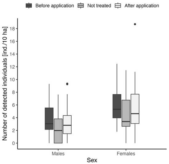 The comparison of roe deer presence before and after repellent application was also performed separately for adult males and females. In both cases, we used the Kruskal–Wallis test for comparison of numbers of detected individuals between before, after, and not treated variants (Figure 4). Individual records were considered “before” and “after” identically as in the previous case. In both cases, insignificant results were obtained: chi-squared = 3.96, df = 2, p = 0.14 for males and chi-squared = 3.68, df = 2, p = 0.16 for females. Males showed lower values of detected numbers in all cases (mean ± SD for “before application”: males—3.8 ± 2.7 ind./10 ha, females—6.0 ± 3.1 ind./10 ha; “after application”: males—3.7 ± 2.4 ind./10 ha, females—6.4 ± 4.1 ind./10 ha; “not treated”: males—2.5 ± 2.5 ind./10 ha, females—4.5 ± 3.7 ind./10 ha, see Figure 4).