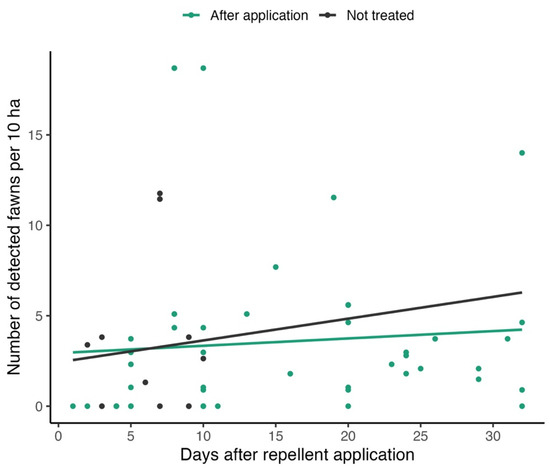 The dependence of relative numbers of detected fawns (ind./10 ha) on the time after repellent application was analyzed by linear regression (separately for plots after repellent application and untreated plots) (Figure 5). Only records after the last repellent application for a particular year were included in the analysis (see Section 2).