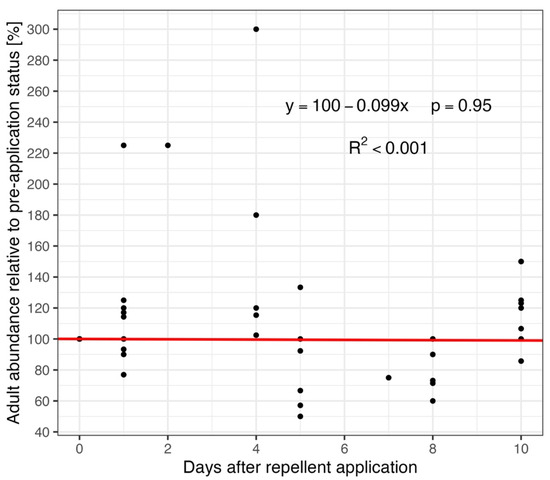 The relationship between adult abundance on research plots with repellent application and the time (days) after repellent application. The mean abundance recorded before the repellent was applied (day 0) was used as the reference value (set to 100%), and all subsequent values are expressed relative to this baseline. The red line depicts the result of linear regression (with fixed intercept of 100, as described in Section 2). Only ten days after the repellent application are selected for analysis, when the repellents are considered most effective (see Section 2).