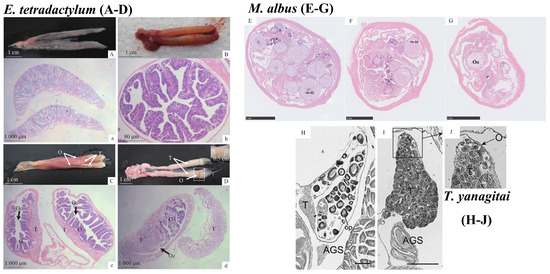 The gonadal tissue structure of three hermaphroditic fish species. (A–D): E. tetradactylum (taken from Lan et al.) [10]; (E–G): M. albus; (H–J): T. yanagitai (taken from Makoto et al.) [19]; (A) Anatomy of the testis; (a) Cross section of testis; (B) Anatomy of the ovary; (b) Cross section of the ovary; (C,D) Anatomy of the transitional gonads; (c,d) Cross section of the transitional gonads; (E) Pre-intersexual development; (F) Middle intersexual development; (G) Late intersexual development; (H) Female, (I,J) male; Oo II: II phase Oocytes; Oo III: III phase Oocytes; Oo: Oocytes; Oc: Ovarian cavity; PSC: primary spermatocyte; AGS accessory gonadal structure; op: oocytes in perinucleolus stage; (A–D) Bar 1 mm; (H–J) Bar 0.5 mm.