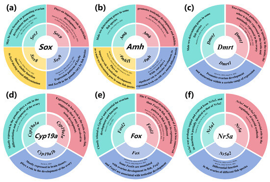 Potential functions of sex genes ((a) Sox [11,12,45,46,47,48,49,50,51,52,53,54,55,56,57,58,59,60], (b) Amh [35,61,62,63,64,65,66,67,68,69,70], (c) Dmrt [34,36,56,71,72,73,74,75,76], (d) Cyp19a [77,78,79,80], (e) Foxl [50,81,82,83,84,85,86,87,88,89,90,91,92] and (f) Nr5a [93,94,95,96,97]) in fish sex differentiation and development.