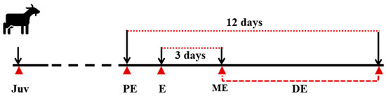 The diagram of sample collection. Red triangles represent the day that goats were sacrificed. Juv, juvenile group, 1-month-old goats. PE, goats that were in proestrus. E, goats that were in estrus. ME, metestrus goats. DE, goats that were in diestrus.