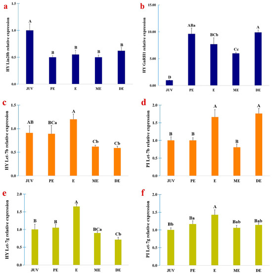 The expression of Lin28b, GnRH1 let-7b, and let-7g miRNA in the hypothalamus and (or) pituitary of goats. (a), Lin28b and (b), GnRH1 in the hypothalamus. (c,d), let-7b in the hypothalamus and pituitary. (e,f), let-7g in the hypothalamus and pituitary. The different capital letters above the columns chart mean a significant difference with p < 0.01, and the different small letter means a significant difference with p < 0.05 in multiple comparisons. PE, proestrus. E, estrus. ME, metestrus. DE, diestrus. HY, hypothalamus. PI, pituitary.