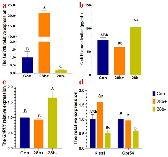 The GnRH1, Kiss1, and Gpr54 expression and GnRH concentration in Lin28b+ and Lin28b− GT1-7 cells. (a), The Lin28b mRNA relative expression. (b), The GnRH concentration in the supernatant. (c), The GnRH1 mRNA relative expression. (d), The relative expression of Kiss1 and Gpr54. The different capital letters above the columns chart mean a significant difference with p < 0.01, and the different small letter means a significant difference with p < 0.05 in multiple comparisons.