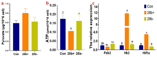 The pyruvate and ATP content and mRNA expression of related genes in Lin28b+ and Lin28b− GT1-7 cells. (a), The pyruvate content. (b), The ATP content. (c), The relative expression of Pdk2, Hk2 and Hif1a. The different capital letters above the columns chart mean a significant difference with p < 0.01, and the different small letter means a significant difference with p < 0.05 in multiple comparisons.