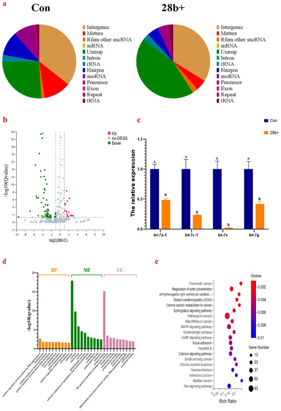 Lin28b overexpression in GT1-7 cells affected the miRNA expression profile. (a), The classification composition of small RNA in GT1-7 cells. (b), Volcanic map of the DEMIs in GT1-7 cells. (c), Verification of DEMIs. The different capital letters above the columns chart mean significant difference with p < 0.01. (d,e), GO and KEGG enrichment analysis of the target genes of DEMIs.