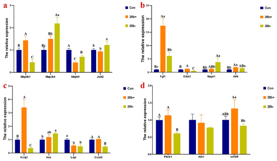 The mRNA expression of several target genes of DEMIs and several key genes in the signaling pathway. (a), Map4k3, Map2k4, Mapk9, and JunD. (b), Fgf1, Erbb2, Mapk1, and Atf4. (c), Kcnj3, InsR, Lepr, and Ccnd2. (d), Pik3r1, Akt1, and mTOR. The different capital letters above the columns chart mean a significant difference with p < 0.01, and the different small letter means a significant difference with p < 0.05 in multiple comparisons.