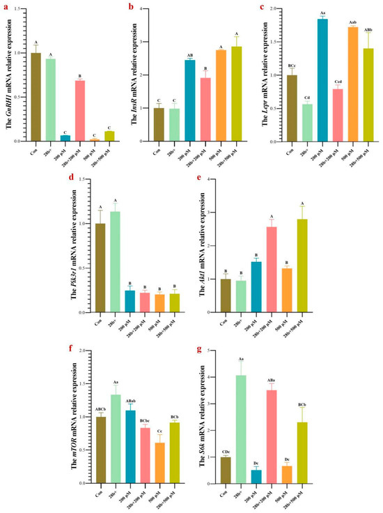 The mRNA relative expression of GnRH1 and genes related to the mTOR signaling pathway in GT1-7 cells with rapamycin treatment and/or Lin28b overexpression. (a), GnRH1. (b,c), InsR and Lepr. (d,e), Pik3r1 and Akt1. (f,g), mTOR and S6k. The different capital letters above the columns chart mean a significant difference with p < 0.01, and the different small letter means a significant difference with p < 0.05 in multiple comparisons. Con, control GT1-7 cells; 28b+, the GT1-7 cells with Lin28b overexpression; 200 μM and 500 μM, the GT1-7 cells treated with 200 μM rapamycin or 500 μM rapamycin, respectively; 28b + 200 μM, the GT 1-7 cells treated with 200 μM rapamycin and Lin28b overexpression at the same time; 28b + 500 μM, the GT 1-7 cells treated with 500 μM rapamycin and Lin28b overexpression at the same time.