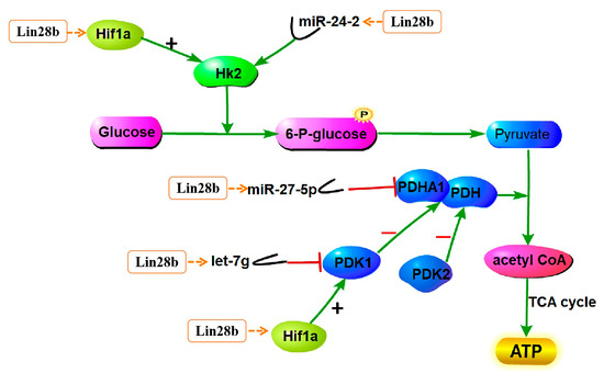 Pyruvate dehydrogenase kinase isozyme 2 (PDK2) phosphorylates pyruvate dehydrogenase (PDH) to inhibit the activity of the pyruvate dehydrogenase complex, which reduces mitochondrial pyruvate metabolism [43]. In Lin28b+ GT1-7 cells, the Pdk2 mRNA expression was significantly downregulated. The Pdha1 gene, encoding a subunit of the PDH, is the target gene of miR-27b-5p, a downregulated DEMI in Lin28b+ cells (Supplement Table S2). Through the dual regulation of Pdk2 and miR-27b-5p, PDH activity might be promoted. In addition, in Lin28a-overexpressed HEK293 cells, PDH expression was significantly increased [41]. Based on these findings, Lin28b overexpression promotes more pyruvate entry into the TCA cycle and ATP production. On the contrary, in fact, pyruvate content was increased, and ATP content decreased in Lin28b+ cells. So, there are other genes or pathways to regulate PDH. It was reported that Hif1a, via its direct target pyruvate dehydrogenase kinase 1 (PDK1), negatively regulates PDH to shut down pyruvate entering into the TCA cycle under hypoxic conditions [44,45,46]. In some tumor cells, Lin28a and Lin28b regulated Pdk1 through let-7g to promote glycolysis and inhibit PDH activity [40]. Let-7g was significantly downregulated, and Hif1a was increased in Lin28b+ cells. In GT1-7 cells, if Lin28b negatively regulates PDH via Hif1a and let-7g, the pyruvate entering into the TCA cycle is inhibited or reduced, leading to decreased ATP content and the accumulation of pyruvate. So, in Lin28b+ cells, it is dominant that Lin28b modulates PDH through Hif1a and let-7g. So, it would be a complex or dual regulation of Lin28b on glycolysis and TCA cycle (Figure 8). Inconsistent with our expectation, the pyruvate and ATP contents, the Hk2 and Hif1a transcript levels were not affected by Lin28b knockdown. To summarize, Lin28b overexpression promoted glycolysis, which was not affected by Lin28b downregulation. These results indicate that Lin28b is not the main limiting factor but rather a stimulus for glycolysis.