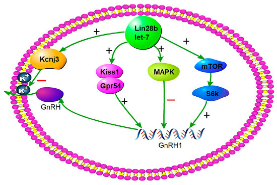 Unfortunately, our results lack protein expression data for key genes in the abovementioned signaling pathways. Despite its limitation, this study suggests that Lin28b-let-7 positively regulates the mTOR and Kiss1/Gpr54 signaling to upregulate GnRH expression and positively regulate the MAPK signaling to downregulate GnRH expression (Figure 9).